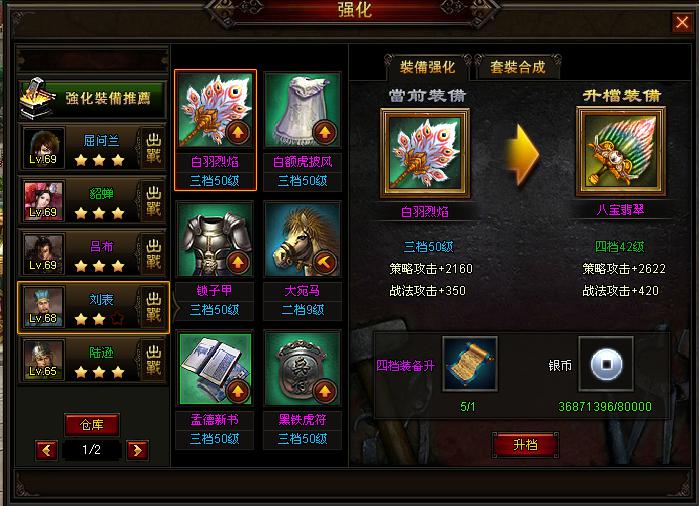 如点击“升档”则选中装备将会升档,升档所需的升档卷轴可以通过精英副本战斗获得。