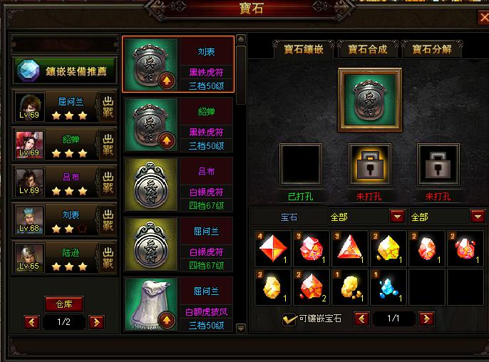 打孔之后就需要为装备镶嵌宝石了,游戏中宝石的主要来源就是攻打黄巾祭坛胜利之后就有机会获得各种镶嵌宝石了,宝石的属性分为三类:防御宝石、攻击宝石、属性宝石,同一件装备只能每样种类宝石镶嵌一个,例如:如果镶嵌了属性宝石:智慧石,那么就不能再镶嵌属性宝石:统率石,同样镶嵌了攻击宝石:物理攻击,就不能再镶嵌攻击宝石:战法攻击。点击宝石或拖动宝石至插槽,可使宝石镶嵌到装备上,如果有相同类型的宝石存在则会替换下来。点击镶嵌后的宝石可以将该宝石移除,移除不会使宝石消失,移除的宝石会回到背包内。