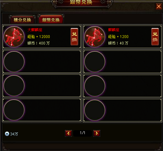 点击银币兑换可以兑换直接使用银币进行兑换大麒麟座与麒麟座。