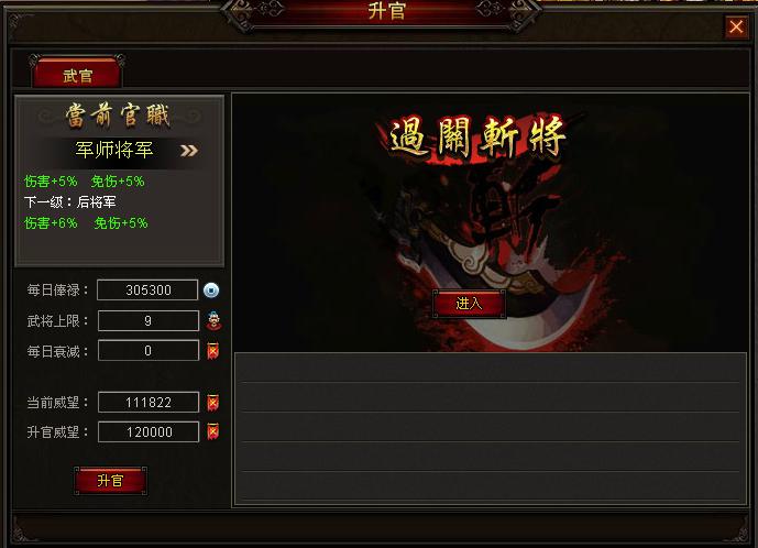 在武官界面的右侧玩家可以进入过关斩将玩法获得大量的威望奖励。在界面右侧显示的是当前玩家的军衔、威望值、获得的每日俸禄的多少以及下一军衔的武将上限与所需达到的威望数值,武官军衔的提升还会带来更高的免伤与伤害加成。